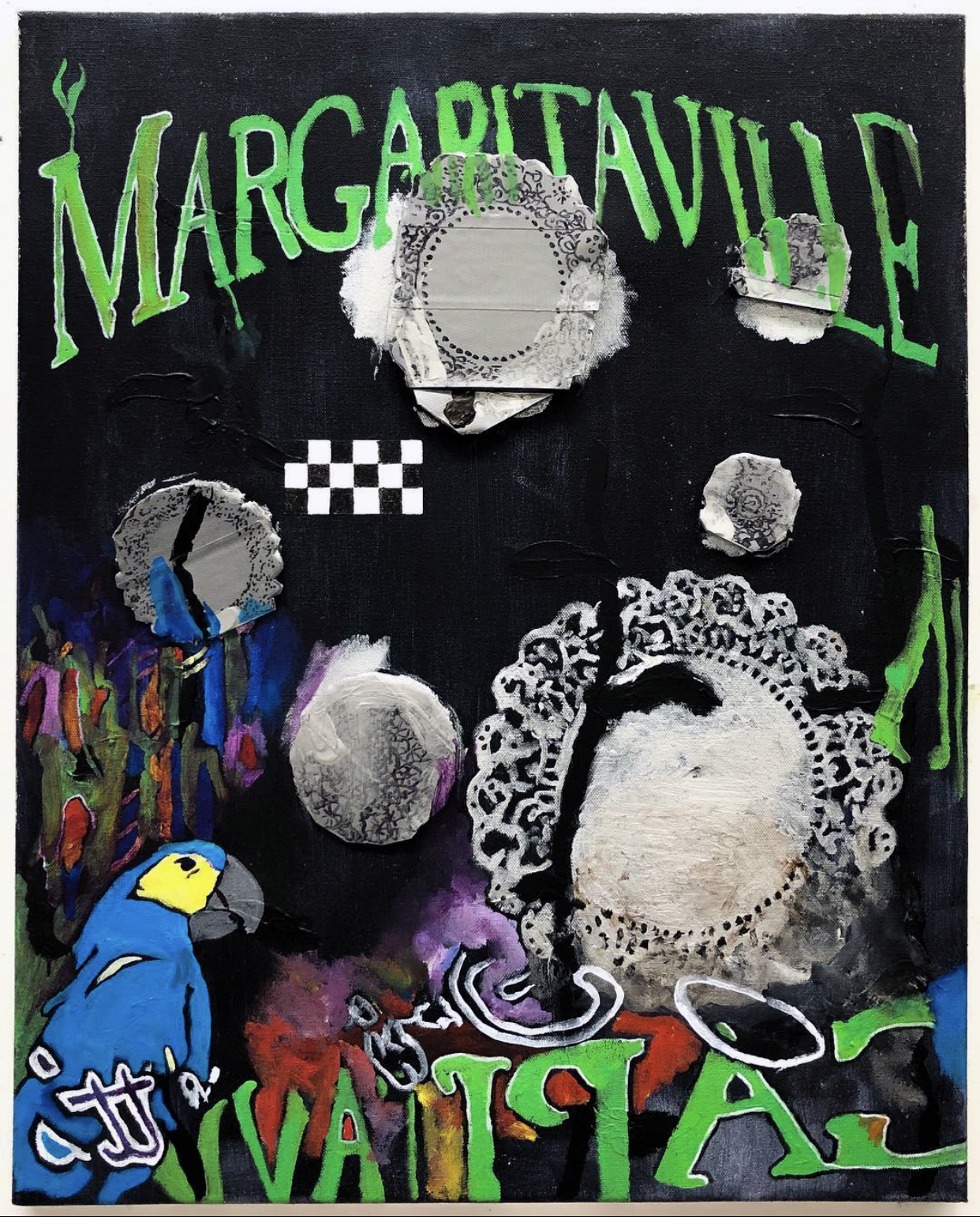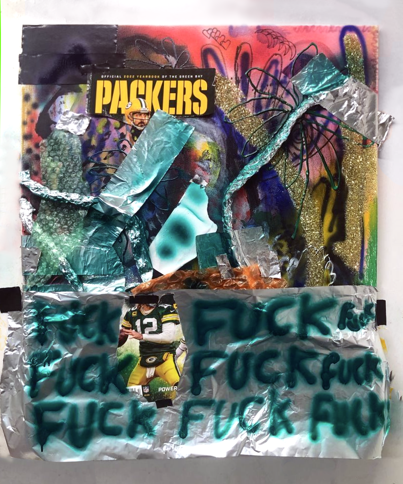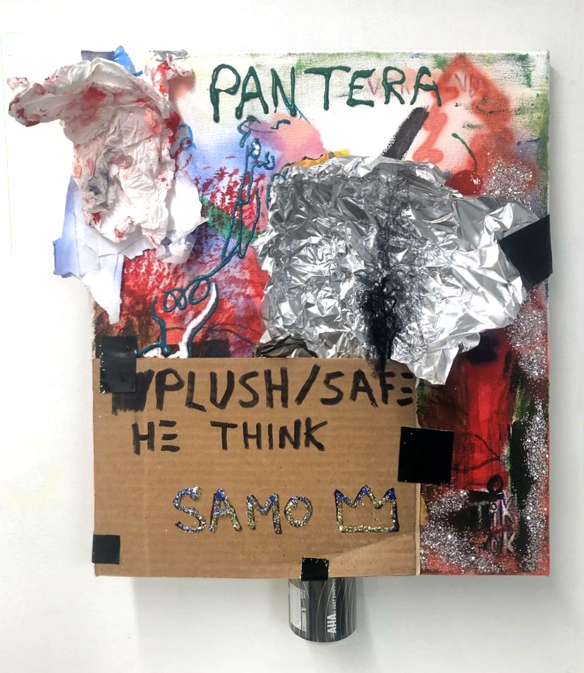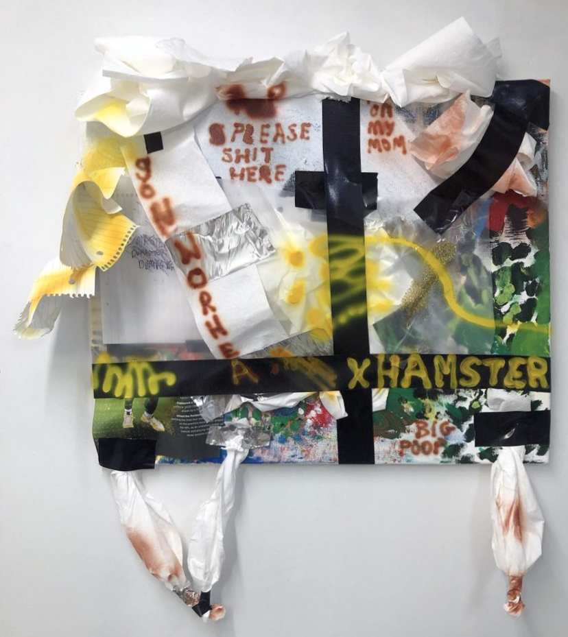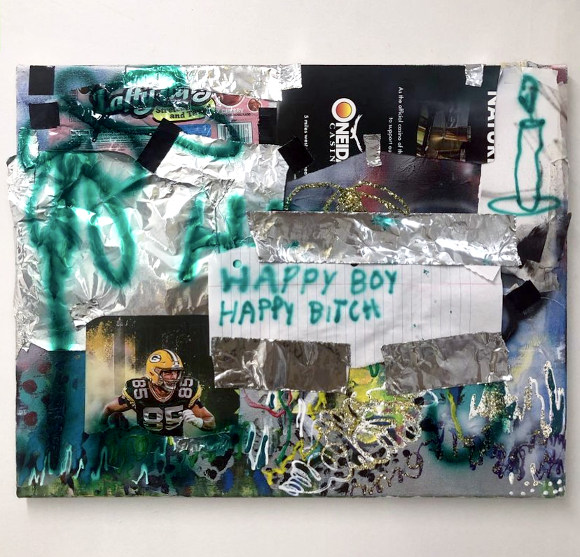 2022 tinfoil, glitter, magazine collage, paper, bubble wrap, aluminum weather tape, pen, gorilla glue tape, acrylic on canvas 30 x 24 in.